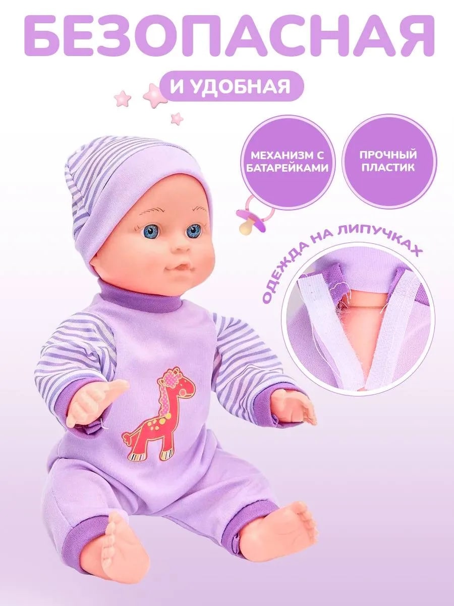 ВНИМАНИЕ! Перед началом использования нужно достать механизм говорения (со стороны спины) и снять ограничитель как показано в видео! Говорящая кукла пупс для девочки с одеждой идеальная игрушка и подарок для маленькой принцессы в возрасте от 2 лет. Милая куколка сделана из качественного безопасного для купания пластика. Стильный пупсик девочка интерактивный сидит, говорит мама и папа, смеется и плачет. Он умеет поворачивать голову и двигать ручки и ножки. Красивая кукла со звуком ростом 32 см идеальна для детских ручек. Яркая игрушка детская имеет съемную одежду на липучках и шапочку. Ребенок сможет легко переодевать карапуза, а также придумать новый наряд. Девочки смогут играть с озвученной куколкой в ванной и заботиться о ней, как о настоящем ребенке. Это прекрасная возможность развить заботу и ответственность, фантазию и мелкую моторику. При погружении пупса в воду необходимо вынуть адаптер с батарейками. Реалистичная игрушка отличный подарок дочке, внучке или на день рождения или новый год.Цены в интернет-магазине могут отличаться от розничных магазинов.