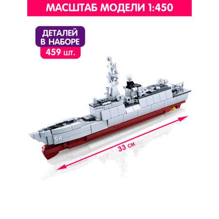 Большой тематический конструктор из 417 деталей, соединив которые у вас получится собрать фрегат размером 33 см, который в выполнен в соответствии с настоящим кораблем в масштабе 1:450. Готовый корабль можно установить на специальную подставку (в наборе). В комплекте также есть модели самолётов, дополняющие сцену. Преимущества: Большая модель, выполненная по прототипу настоящего корабля; Возможность использовать готовую игрушку в качестве украшения интерьера; Детали с лёгким соединением; Инструмент для разборки конструктора в наборе.