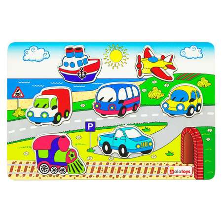 Деревянный пазл с 7 деталями-вкладышами, которые необходимо правильно разместить на платформе-основании. Игрушка развивает мелкую моторику, знакомит юных исследователей с разными видами транспорта.
