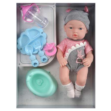 Игровой набор Junfa Пупс 35 см в розово-серой одежде и шапочке с горшком, бутылочкой, соской и предметами для кормления