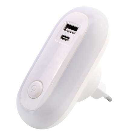 USB И Type-C разъемы Управление с помощью касания Напряжение питания 220В Мощность: 1ВтU вых: 5ВI вых: 2A Цвет корпуса: белый Материал: пластик Цветовая температура: изменяется 3000К-4500K-6000КВилка в розетку поворачивается