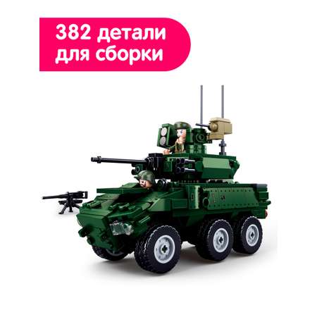 Тематический конструктор из серии "Армия", состоящий из 384 деталей, соединив которые у вас получится собрать колёсную боевую машину. В наборе также есть фигурки, дополняющие сцену.
