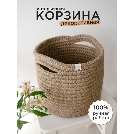 Большая корзина из натурального джута с интересными ручками, сделанная вручную. Хорошо держит форму за счет каната в основе корзины. Джутовую корзину можно использовать во влажных помещениях, джут хорошо переносит влагу. А деревянное дно корзины позволяет выдерживать большой вес. Донышко обработано специальным водоотталкивающим лаком.