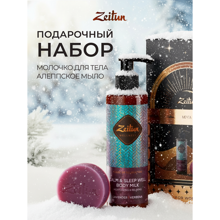 Подарочный набор для ухода за телом «Ритуал расслабления» от бренда Zeitun включает два продукта, которые создадут атмосферу спа прямо во время домашнего ухода за собой. 1) Увлажняющее молочко с лавандой и вербеной — основа защиты кожи от сухости. Нежная текстура смягчает и насыщает ее влагой, а ароматы натуральных эфирных масел лаванды и вербены успокаивают и способствуют глубокому сну. Лаванда известна своим расслабляющим действием, вербена помогает улучшить настроение и обладает антисептическими свойствами.2) Алеппское мыло с лавандой — натуральный продукт, созданный по древней восточной рецептуре. Основные компоненты мыла — оливковое и лавровое масла. Они питают и увлажняют кожу, делают ее мягкой и шелковистой. Благодаря натуральному составу мыло подходит для всех типов кожи, включая чувствительную.