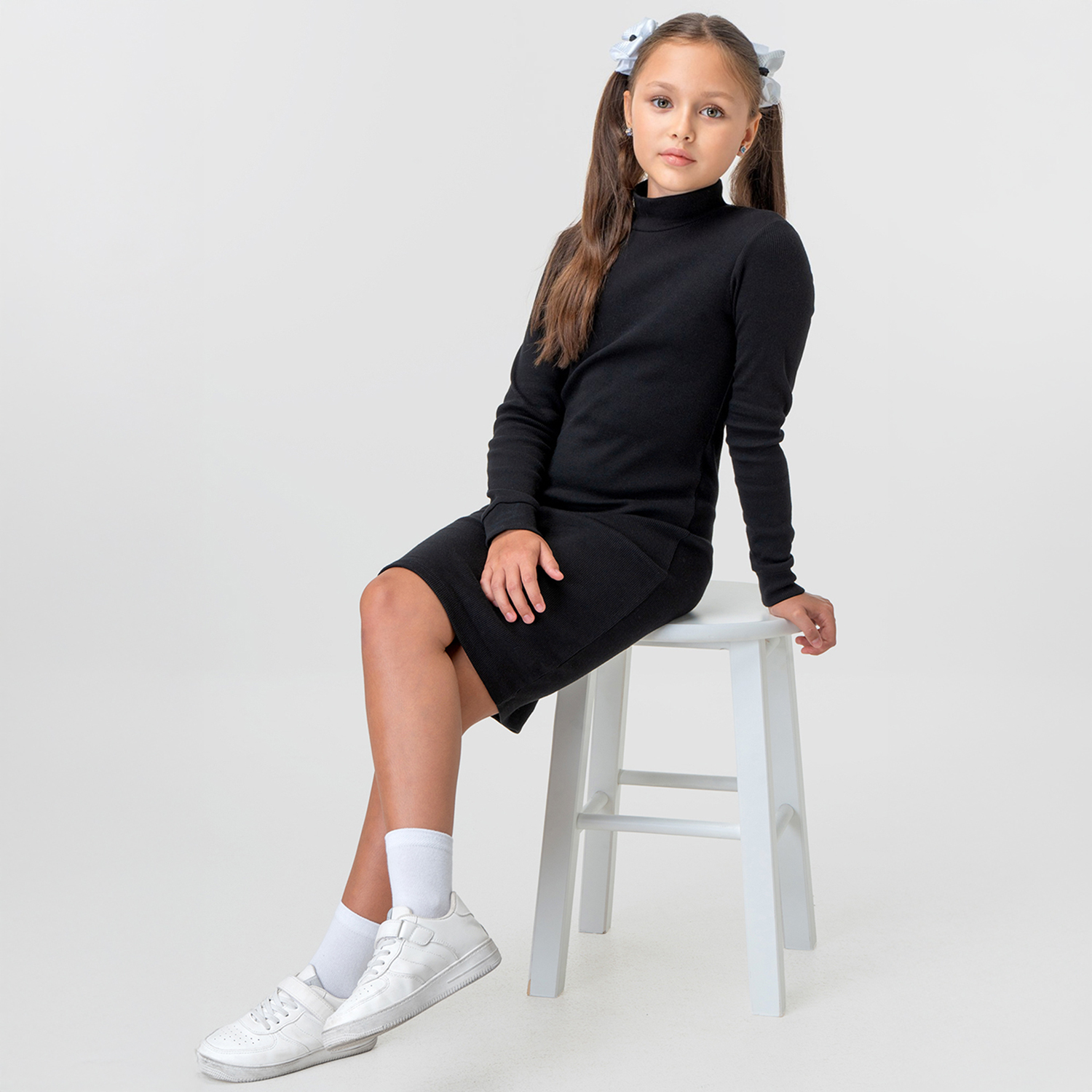 Очарование в простоте! Детское платье-водолазка для девочек и девочек-подростков выполнено из плотной трикотажной ткани кашкорсе. Облегающий силуэт, длинный рукав на манжете и воротник стойка – каждая деталь делает платье для детей элегантным.