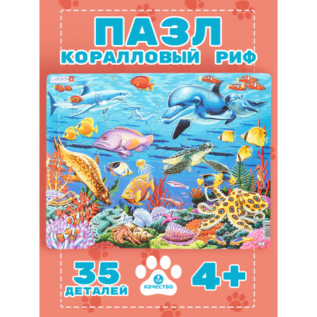 Здесь представлено большое разнообразие подводных видов, в том числе морская черепаха, рыба-клоун, кольчатая нерпа, семейство афалин, фиолетовая морская звезда, гигантский синекольчатый осьминог, медуза-компас, морской конек, замерший на фоне кораллов, большая белая акула, рыба гарибальдия, огненная рыба-ангел, акула-молот, рыба-бабочка, черноплавниковая барракуда, седловидная рыба-ангел, гигантский моллюск, краб-отшельник, морской анемон и очень красочный морской слизень. На морском дне среди прочных кораллов можно встретить креветок, рыбу-сержанта, конических улиток, испанских бодианов и рыбу Ангел-изабелита трёхцветная. Этот красочный пазл радует глаз, давая неоспоримое преимущество в визуальном изучении глубокого синего океана. Некоторые детали пазла сделаны в форме рыб, акулы, дельфина, морской звезды, что позволяет расширить возможности для игры. В наборе: 35 элементов пазла. Размер собранного поля - 36,5 х 28,5 см.