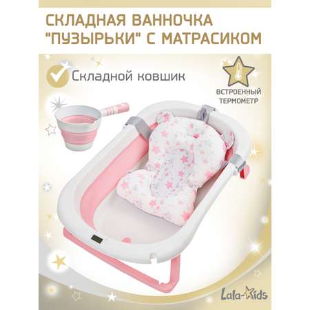 Ванночка для купания новорожденных с термометром LaLa-Kids идеально подойдет для комфортного и безопасного купания малышей с рождения! Правильно организованный процесс купания подарит множество приятных эмоций малышу и его родителям! Складная ванночка удобна в хранении и позволит вам сэкономить место в вашем доме, толщина в сложенном виде всего лишь 9 см.