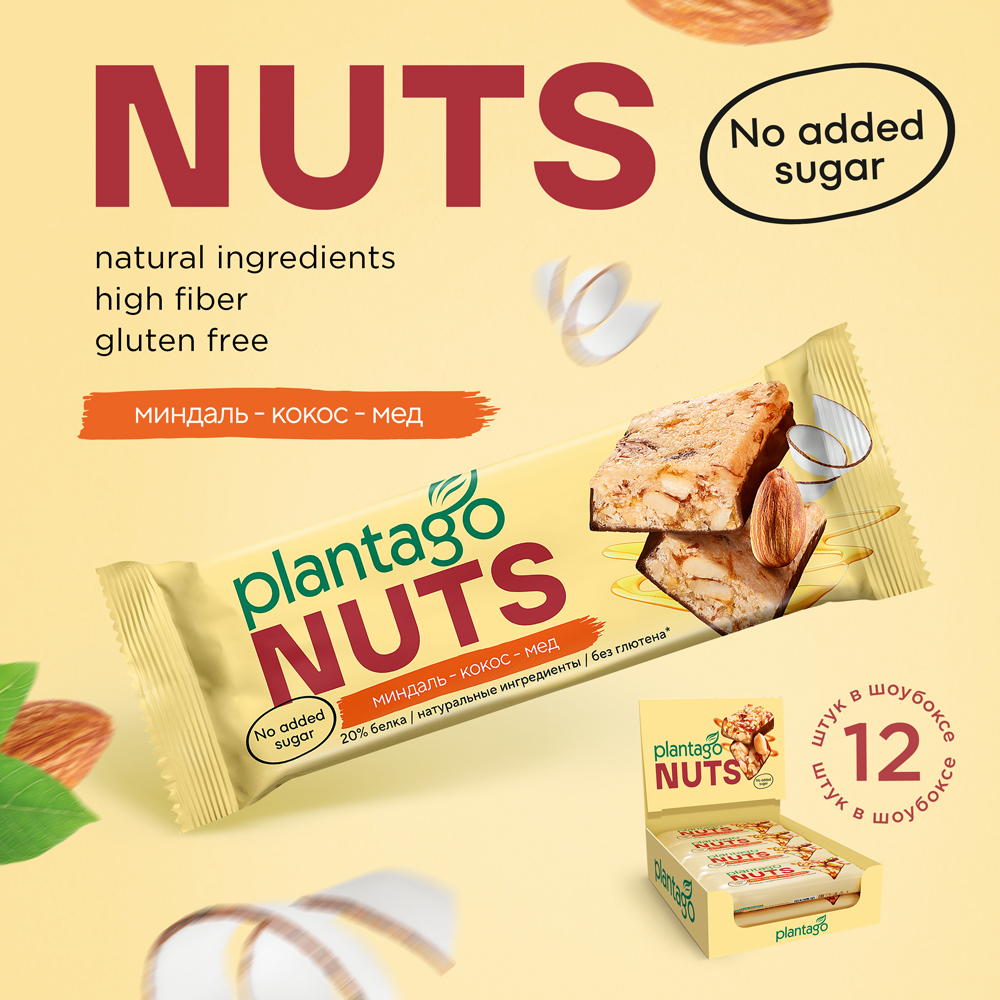 Протеиновые батончики Plantago NUTS 20% белка)Миндаль-Кокос-Мёд 12 шт по40 гр