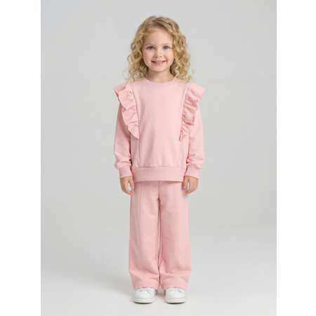 Комплект одежды для девочки KUZA состоит из свитшота и брюк палаццо. Свитшот для девочки на удобных манжетах из кашкорсе. Спереди свитшота расположены декоративные рюши. Брюки для девочки средней посадки, расклешенные к низу, по переду брюк декоративная отстрочка. Комплект изготовлен из 2-х ниточного петельчатого футера с эластаном премиум качества пенье (92% хлопок, 8% эластан).