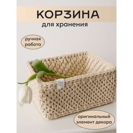Стильная средняя корзина из текстиля, сделанная вручную. Хорошо держит форму и отлично подойдет для разных мелочей в ванную комнату, спальню или детскую. Можно использовать для хранения косметики, салфеток, небольших полотенец для лица, а также на кухне для специй или других предметов. Специальный материал полиэфир, из которого связана корзинка, не пачкается и легко моется, быстро сохнет.
