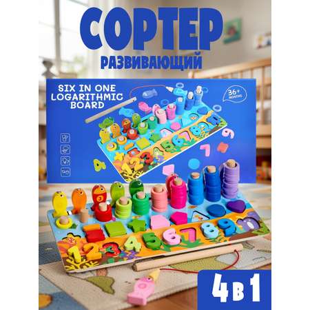 Занимательная настольная игрушка совмещает в себе сразу несколько интересных игр: сортер для изучения фигур и цифр, любимая малышами магнитная рыбалка, пирамидка с разноцветными кольцами.