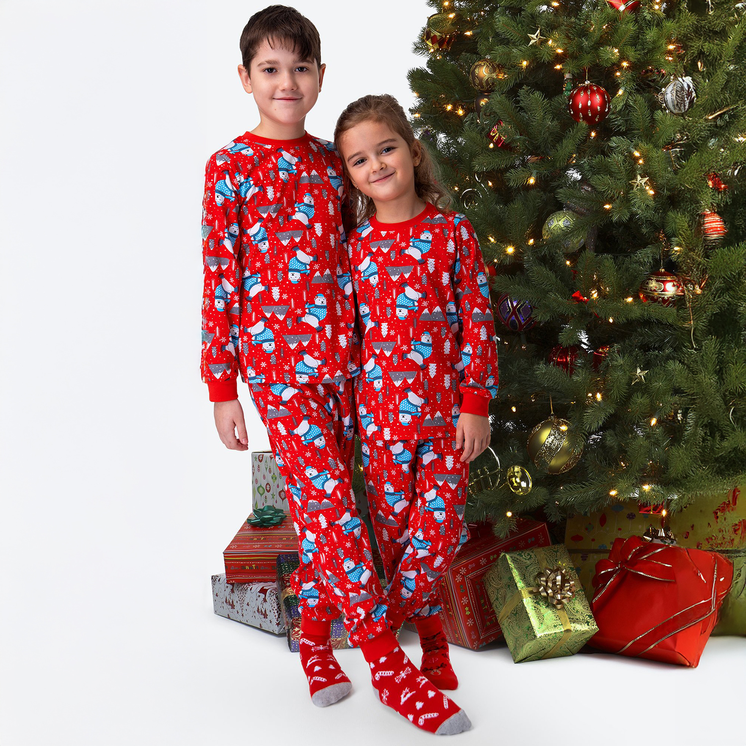 Детская новогодняя пижама с брюками выполнена из натурального 100% хлопка. Свободный крой не сковывает движений и позволяет ребенку всегда оставаться активным, а яркий красный цвет и праздничный принт Мишки создают уютную атмосферу и поднимают настроение. Трикотажная пижамка для мальчиков и девочек станет отличным подарком на Новый год и Рождество.