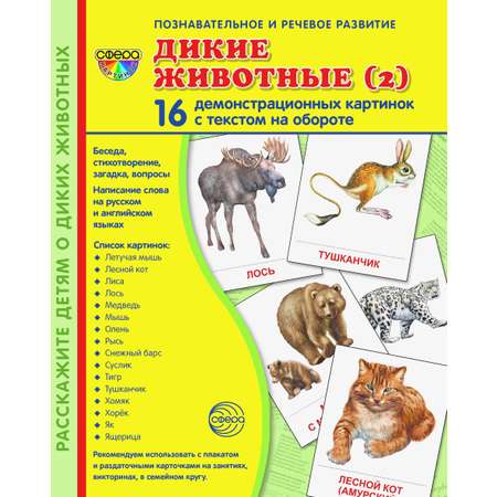 16 демонстрационных картинок размером 173х220 мм для познавательного и речевого развития. На обороте каждой предметной картинки — описание животного, стихотворение, загадка, вопросы для ребёнка, название животного на русском и английском языках. Список картинок: ♦ Летучая мышь ♦ Лесной кот ♦ Лиса ♦ Лось ♦ Медведь ♦ Мышь ♦ Олень ♦ Рысь ♦ Снежный барс ♦ Суслик ♦ Тигр ♦ Тушканчик ♦ Хомяк ♦ Хорёк ♦ Як ♦ ЯщерицаЦены в интернет-магазине могут отличаться от розничных магазинов.