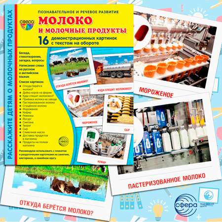 Комплект состоит из 16 цветных демонстрационных картинок, адресован детям и их родителям, желающим познакомиться с современными технологиями изготовления молочной продукции, ее многообразием и значением для жизнедеятельности человека. На лицевой стороне каждой карточки дается цветное изображение молочного продукта, на обратной — подробное описание, из которого дети узнают много интересного и поучительного. Для лучшего закрепления материала представлены оригинальные стихотворения и рифмованные загадки по теме, а также вопросы, на которые ребенок ответит после изучения материала или беседы со взрослым. Комплект подходит для индивидуальной и групповой работы, с детьми 5-9 лет. Список картинок: ♦ Откуда берется молоко? ♦ Дойка коров на ферме ♦ Куда спешит молоковоз? ♦ Приемка молока на заводе ♦ Пастеризованное молоко ♦ Сгущенное молоко ♦ Мороженое ♦ Кефир ♦ Ряженка ♦ Йогурт ♦ Сметана ♦ Творог ♦ Сыр ♦ Сливочное масло ♦ Доставка продуктов в магазины ♦ Продукты на полках магазинаЦены в интернет-магазине могут отличаться от розничных магазинов.