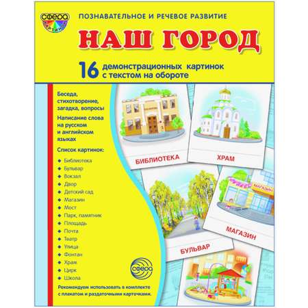 16 демонстрационных картинок размером 173х220 мм для познавательного и речевого развития. На обороте каждой предметной картинки — описание, стихотворение, загадка, вопросы для ребёнка, название на русском и английском языках. 1. Библиотека 2. Бульвар 3. Вокзал 4. Двор 5. Детский сад 6. Магазин 7. Мост 8. Парк, памятник 9. Площадь 10. Почта 11. Театр 12. Улица 13. Фонтан 14. Храм 15. Цирк 16. ШколаЦены в интернет-магазине могут отличаться от розничных магазинов.
