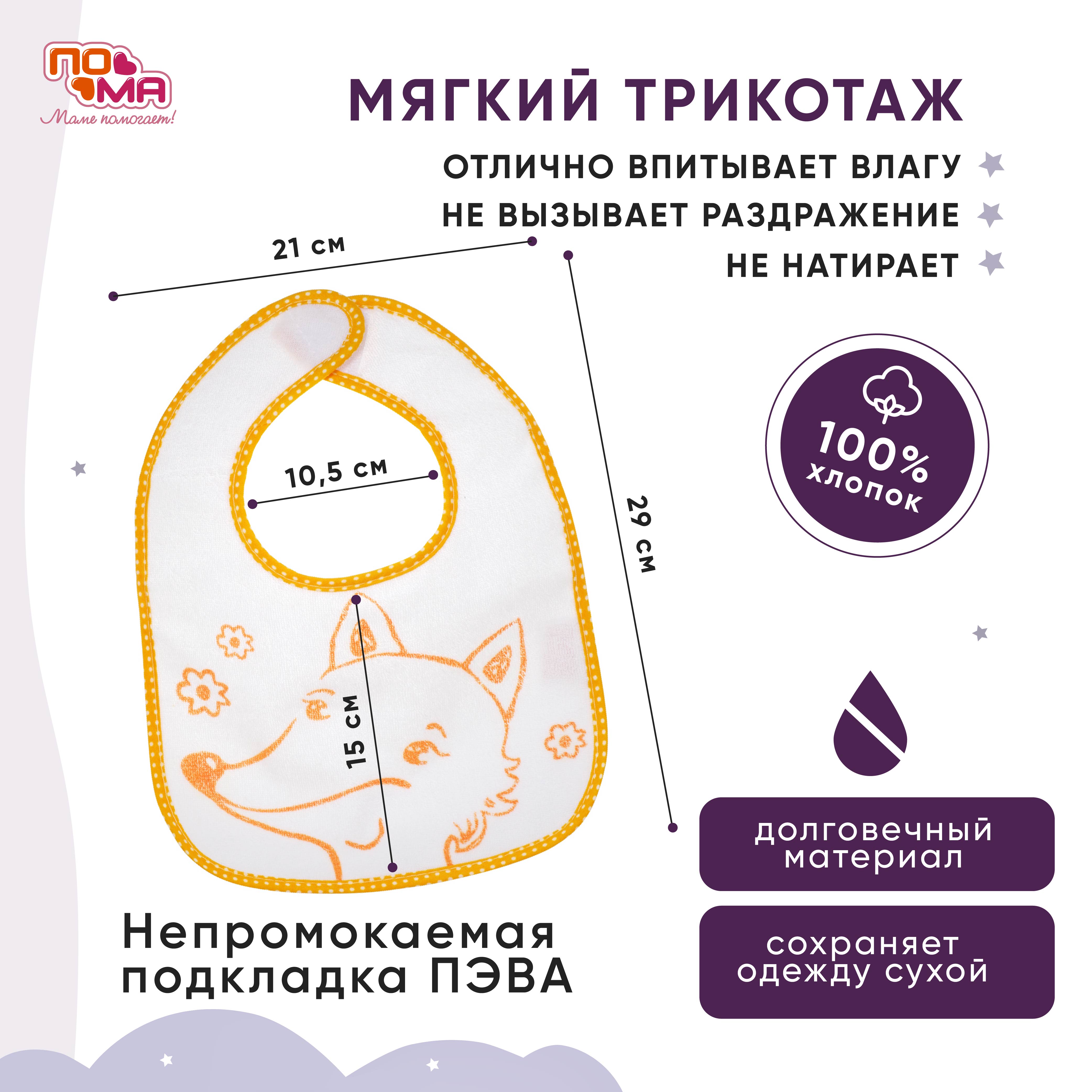Махровые слюнявчики ПОМА - это незаменимый помощник для маленьких гурманов, который позволяет легко и удобно есть любимые блюда. Создан специально для новорожденных и маленьких детей, чтобы обеспечить им максимальный комфорт и удобство во время кормления. Подкладка состоит из клеёнчатого непромокаемого материала - ПЕВА, одежда останется чистой и сухой, внешняя сторона махрового нагрудника состоит из высококачественного хлопка, можно протирать нежную кожу лица крохи, не боясь раздражения, это делает его очень комфортным и практичным в использовании. Легко застегивается с помощью надежной застежки - липучки.Слюнявчик создает барьер между кожей и слюной, предотвращая возникновение раздражений.Яркий и красочный рисунок создаст атмосферу волшебства и веселья во время кормления. Еще одним преимуществом слюнявчика является его легкость в уходе. Он легко отстирывается при ручной стирке, что позволяет сохранить его чистоту и свежесть на протяжении длительного времени.