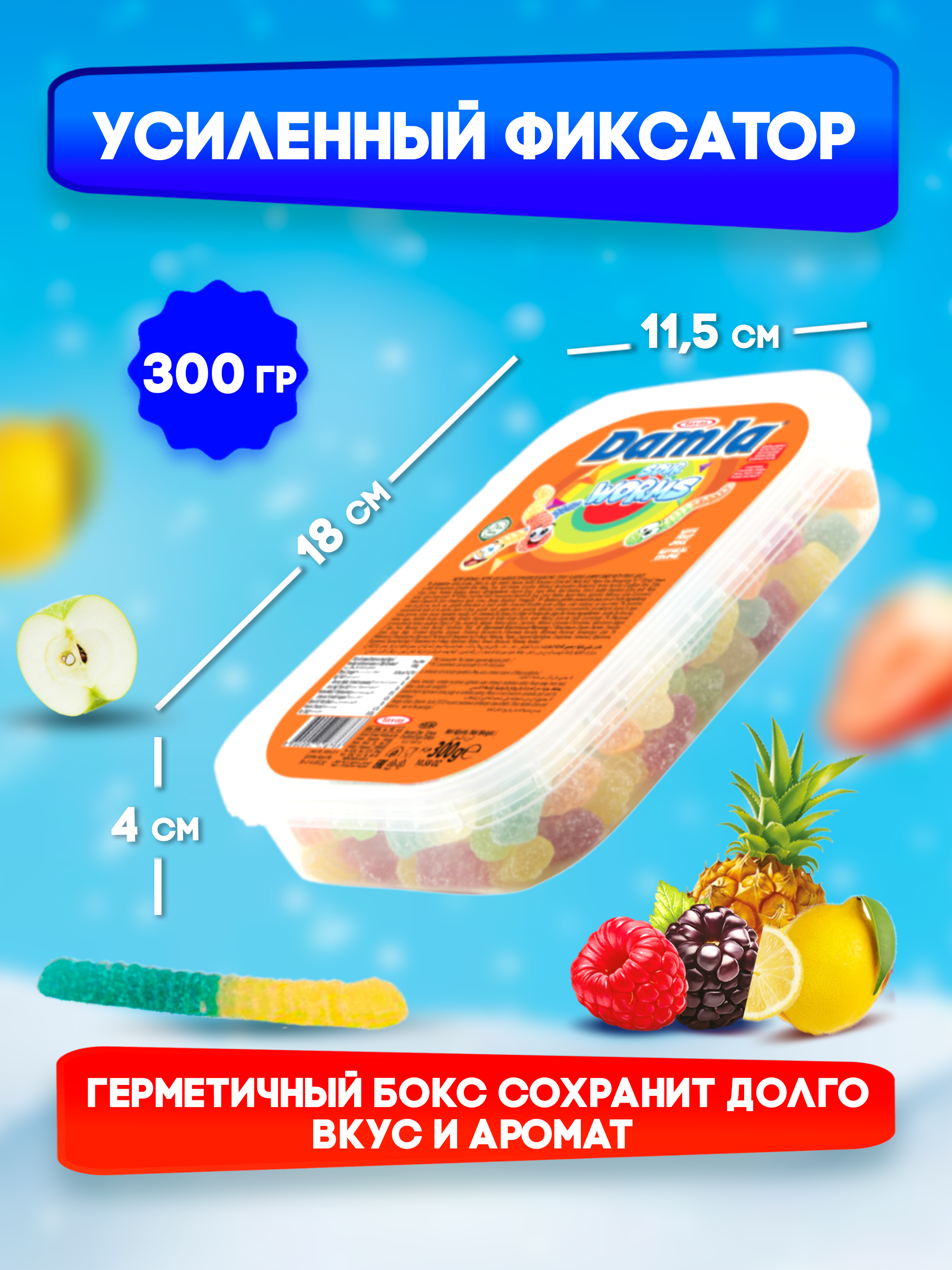 Желейный мармелад Damla gummy sour червячки - это вкусный и полезный десерт, который придется по вкусу как детям, так и взрослым. Мармелад Damla gummy sour обладает кисло-сладким вкусом ананаса и фруктовым ароматом, что делает его отличным выбором для любителей экзотических вкусов. Все ингредиенты являются натуральными и соответствуют стандартам производства. Мармелад упакован в удобный пластиковый контейнер, который обеспечивает сохранность продукта и удобство хранения. Продукт является халяльным и кошерным, что делает его подходящим для питания в пост. Энергетическая ценность мармелада составляет 344 ккал на 100 грамм продукта. В составе мармелада содержатся белки (4,9 г на 100 г), углеводы (81 г на 100 г) и жиры (0,03 г на 100 г). Продукт следует хранить в сухом и прохладном месте при температуре от +8°C до +25°C и относительной влажности воздуха не более 75%. Избегайте попадания прямых солнечных лучей на упаковку. Выбирая желейный мармелад Damla gummy sour червячки, вы получаете вкусный, натуральный и полезный десерт, который станет отличным дополнением к вашему столу.