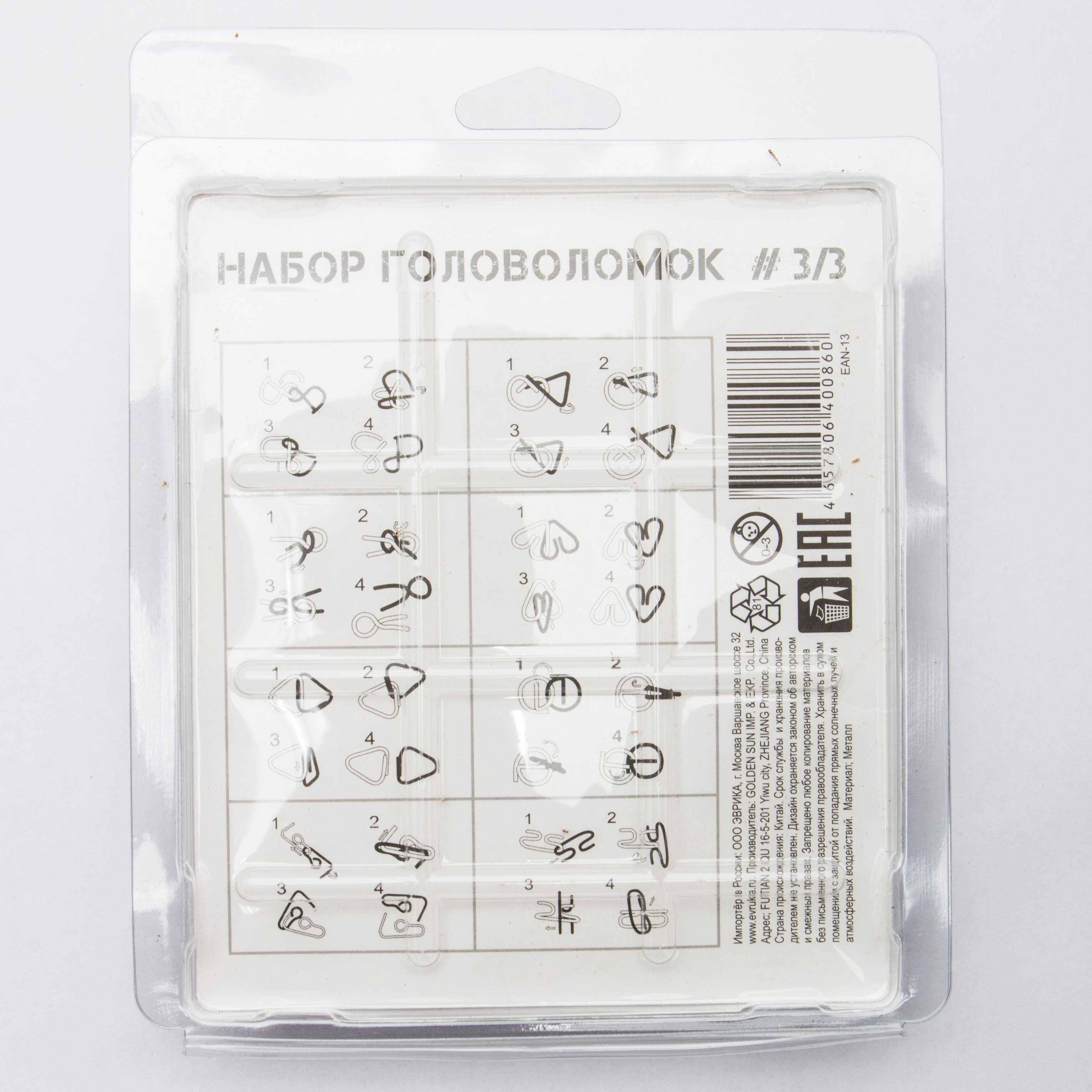 Подарочный набор из 8-ми металлических головоломок нацелен на развитие IQ способностей детей и взрослых. Задача любой головоломки разделить две детали и впоследствии соединить их обратно. Все головоломки имеют разный уровень сложности. Не все смогут разобрать и собрать обратно головоломку, поэтому на обратной стороне есть подсказки. При игре с этой головоломкой развивается логика, пространственное и нестандартное мышление, мелкая моторика пальцев, тренируется внимательность и терпение. Головоломки выполнены из металла. Головоломки не оставят без внимания детей и даже взрослого человека и погрузят их в увлекательный мир загадок и лабиринтов.Комплектация: 8 головоломок различной формы.Материал: металлУпаковка: пластиковый прозрачный блистер с еврослотом.Размер упаковки: 23х180х140 мм.Размер головоломок: 6 шт. ~ 50х30х12 мм. 1 шт. ~ 40х35х12 мм. 1 шт. ~ 60х35х12 мм.Вес нетто набора: 120 гр.Продукция сертифицирована и соответствует требованиямТехнического регламента Таможенного союза ТР ТС 008/2011Цены в интернет-магазине могут отличаться от розничных магазинов.