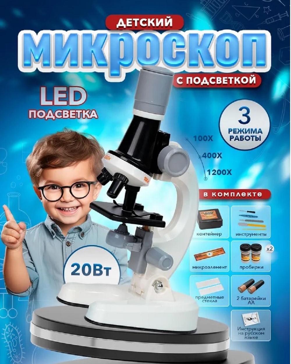 На учебе в школе на биологии и ботанике детям рассказывают о строении клеток, разных структурах и тому подобном, что можно рассмотреть только с помощью специального увеличительного прибора. Но далеко не всегда школьные лаборатории оснащены всем необходимым. Важно, чтобы знания ребенка носили не только теоретический, но и практический характер, - это и есть то, для чего нужен микроскоп. Увеличение возможно в 100x, 400x, 1200x. Ребенок с легкостью научится пользоваться микроскопом, который продемонстрирует, как выглядят клетки живых организмов. Пришло время попробовать себя в роли учёного и исследовать мир вокруг! С игровым набором ребёнок сможет изучить всё! Начните с исследования образцов микропрепарата и продолжите любыми интересующими вас предметами: от ниток и капелек воды до кристаллов. . Множество знакомых нам предметов будут выглядеть совсем по другому, если посмотреть на них используя микроскоп. Листочки растений, споры папоротника и даже обычный человеческий волос вызывают восторг у детей, если их многократно увеличить. Подсветка и увеличение в 100, 400 и даже 1200 раз помогут в изучении микромира. Для работы требуются 2 батарейки типа АА, которые входят в комплект. Детский микроскоп выполнен с максимальным подобием на настоящий аппарат, обладает всеми функциональными частями. Прибор изготовлен с применением только качественных линз, которые не приносят усталости глазам. Встроенная светодиодная подсветка также обеспечивает комфортное использование микроскопа. Микроскоп настольный станет отличным подарком не только для детей, но и для людей любого возраста и любой профессии. Комплектация: детский микроскоп, слайд с образцом, 2 пустых слайда, 2 ёмкости для образцов, футляр для образцов, крестовая отвертка, пластиковый скальпель, пластиковый шпатель, пластиковый пинцет, пластиковая игла, инструкция.
