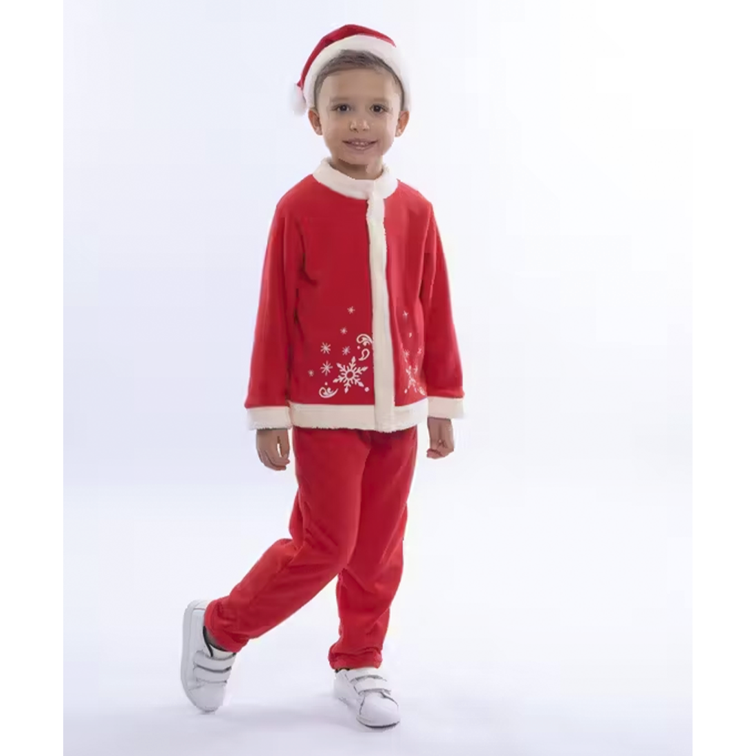 Карнавальный комплект Дед Мороз для мальчика включает в себя кофту, штаны и шапку.
