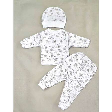 Комплект для новорожденного состоящий из распашонки с открытой ручкой, на трех кнопках ,одна потайная,штанишек на резинке ,шапочки на манжете. Комплект изготовлен из 100% хлопка-кулирная гладь.