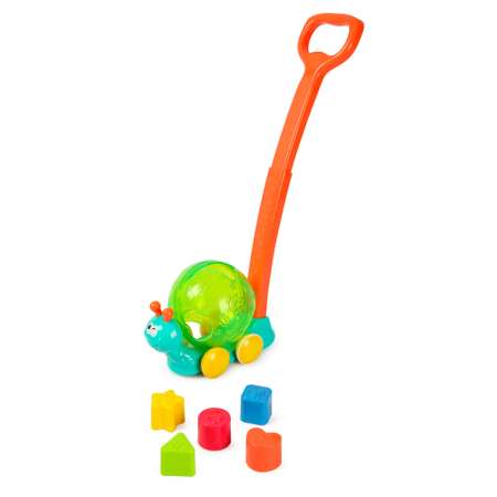 Развивающая игрушка-каталка Play Go «Улиточка» станет веселым спутником на прогулке. Она оснащена ручкой, за которую малышу будет удобно держаться и толкать. Во время движения вперед голова улитки начнет забавно поворачиваться, а шар-раковина на спине вращаться. Раковина улитки служит сортером: в ней есть отверстия, а внутри лежат пять разноцветных фигурок разных форм. Малышу предстоит найти для каждой фигурки свое отверстие, развивая логику, моторику и координацию движений.