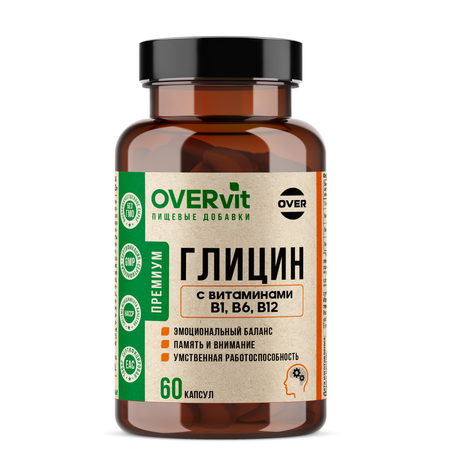 Глицин с витаминами группы В, OVER БАД для улучшения работы головного мозга, 60 капсул