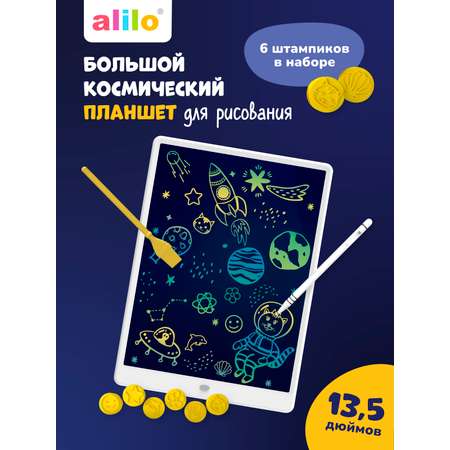 Большой космический планшет для рисования alilo: теперь со стилусами и штампиками! Графический планшет alilo позволяет ребёнку создавать яркие рисунки и интересные сюжеты. Он подходит для рисования, обучения, написания заметок. Больше не нужны бумага и карандаши – пишите и рисуйте на планшете с помощью стилусов и штампиков и стирайте одним нажатием кнопки. Экологично и экономично – планшет alilo сделан специально для детей! 1) Безопасность и прочность Материал корпуса выполнен из ABS-пластика, который в 30 раз прочнее обычного, жидкокристаллический экран выдержит случайные падения при ежедневном использовании. У планшета нет собственной подсветки, он не мерцает и не излучает синий свет, поэтому безопасен для детских глаз. 2) Яркие, переливающиеся цвета Планшет оснащён ярким жидкокристаллическим дисплеем диагональю 13,5 дюймов. Цвета линий меняются в зависимости от того, на какой части экрана вы рисуете. Разнообразие цветов привлечёт внимание ребёнка, развивая у него цветовое восприятие. 3) Очистка экрана одним нажатием Стереть рисунок очень просто – нажмите на кнопку внизу, и рисунок мгновенно исчезнет. 4) Защита от случайного стирания Сзади на планшете есть кнопка блокировки от случайного удаления, переведите её в закрытое положение, и вы сможете защитить рисунок от стирания. 5) Чувствительность к нажатию Чем сильнее надавить стилусом на экран при рисовании, тем толще линия получится, и наоборот. Делайте слегка заметные штрихи или рисуйте яркие, плотные линии, создавая разнообразные шедевры. 6) Работает от батарейки Одной батарейки хватит на сотни циклов использования, энергия расходуется только при стирании рисунка. Батарейка идёт в комплекте. Основные характеристики: Подходит для детей от 3 лет. Диагональ: 13,5 дюйма. Питание: батарейка литиевая CR2016 (есть в комплекте). Комплектация: планшет, 2 стилуса, 6 штампиков, батарейка
