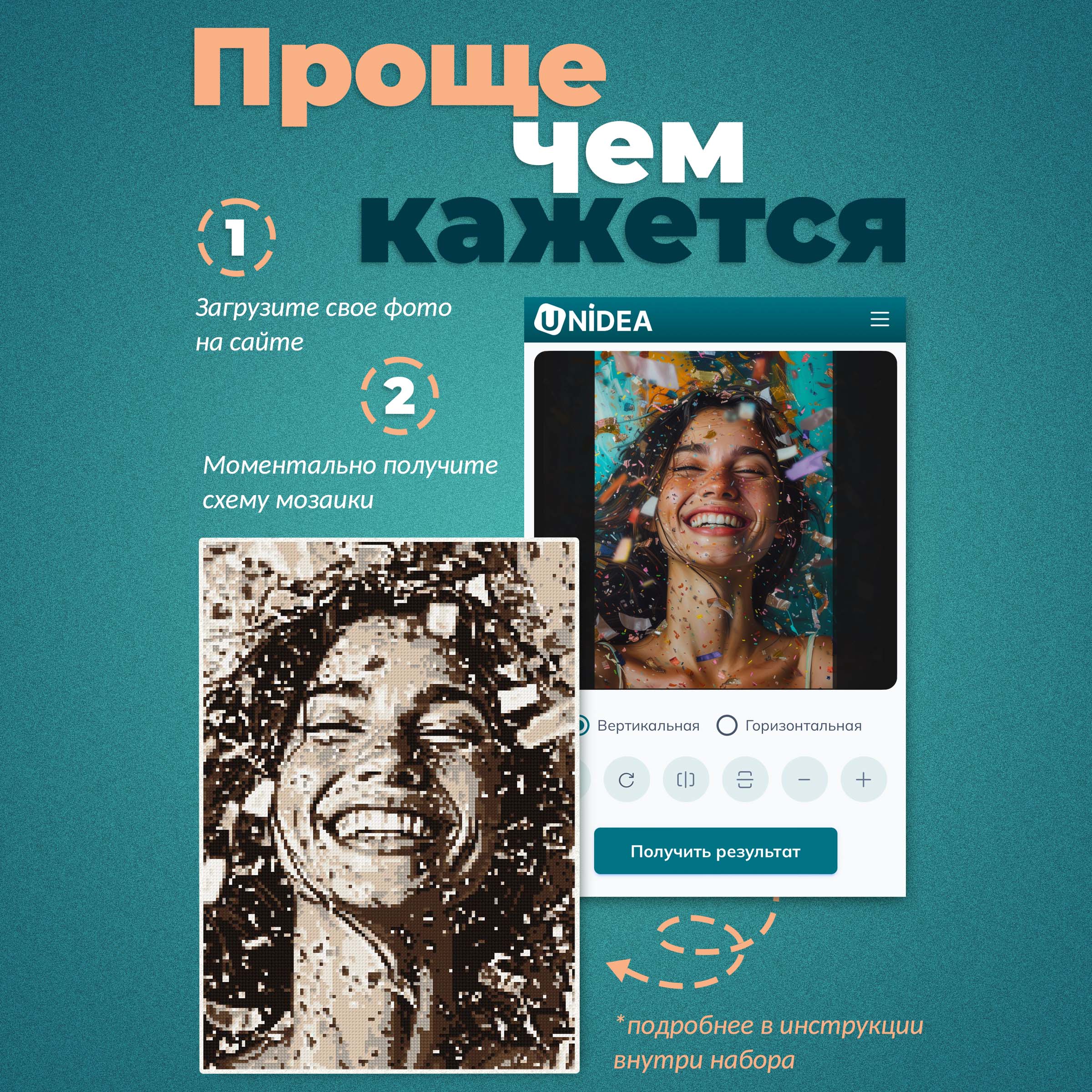 UNIDEA предлагает алмазную мозаику по фотографии - уникальное произведение искусства из разноцветных матовых страз, которые блестят и переливаются благодаря своей гладкой поверхности. Такой подарок непременно порадует женщин, мужчин, девушек и парней. Готовая работа может быть покрыта акриловым лаком, или помещена в рамку под стекло - это сделает ее прекрасным элементом интерьера вашего дома. Мы создаем коробки с уникальным дизайном, что делает наши наборы отличным подарком к любому празднику. В комплект алмазной мозаики по фотографии на подрамнике мы вложили все необходимое для создания неповторимого произведения искусства. Приобретя наш набор, вы получите возможность создать портрет или любую другую картину по вашей фотографии! Всеми любимая на рынке алмазная вышивка по фото теперь доступна в уникальных цветах, которые скоро станут культовыми. Мы не забываем о качестве продукции и уделяем огромное внимание деталям. С любовью, UNIDEA!Цены в интернет-магазине могут отличаться от розничных магазинов.