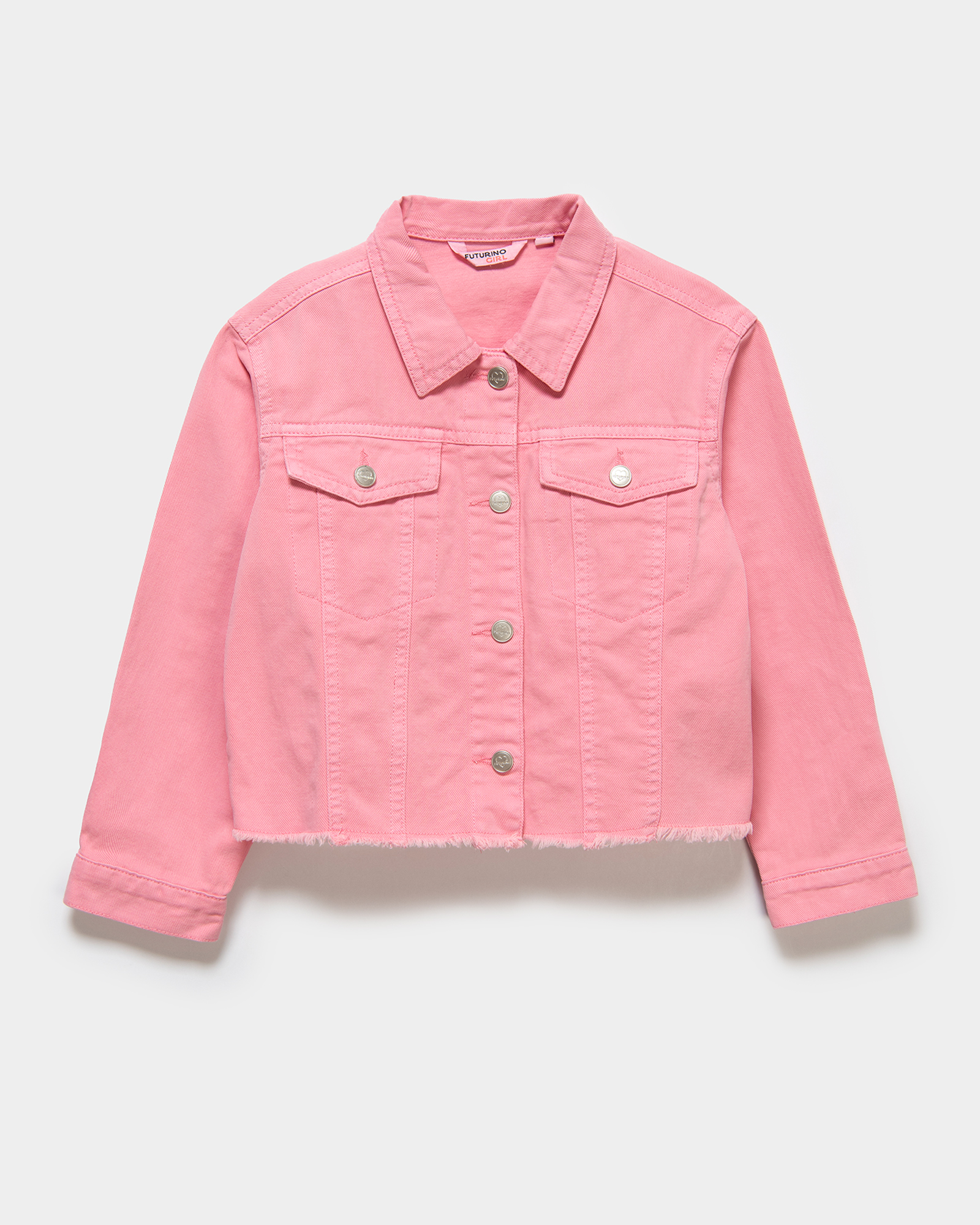 Укороченная джинсовка для девочки Futurino розового цвета, с бахромой по низу.