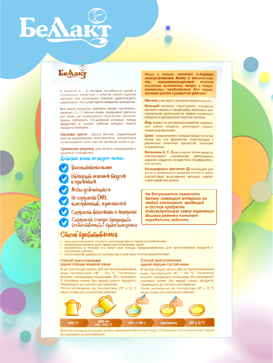 | Состав: | Молоко сухое козье цельное; мука рисовая; мальтодекстрин; инулин; масло кукурузное; минеральные вещества: кальция лактат, цинка сульфат, железа сульфат, йодид калия; витамины: С (L-аскорбиновая кислота), РР (никотинамид), Е (DL- альфа токоферол ацетат), А (ретинола пальмитат), В1 (тиамина гидрохлорид), В2 (рибофлавин), Д3 (холекальциферол). |