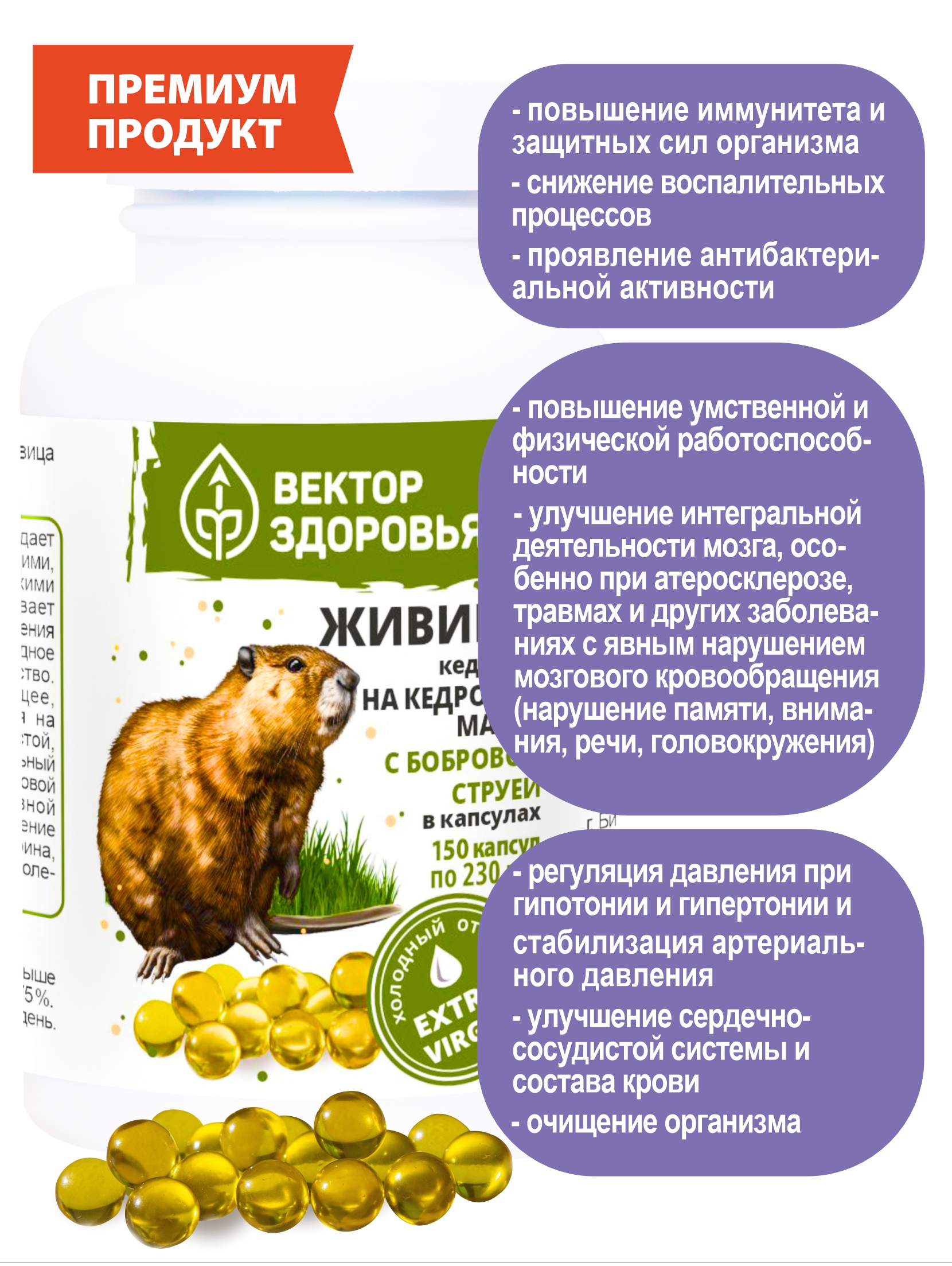Живица кедровая на кедровом масле обладает бактерицидными, противогрибковыми, заживляющими и противовоспалительными свойствами. Она восстанавливает энергию после умственного и физического напряжения. Бобровая струя – природное противовоспалительное вещество, укрепляющее и омолаживающее организм. Улучшает работу сердечно-сосудистой, нервной и иммунной систем, нормализует гормональный фон и стимулирует половую активность. Комплекс улучшает состав крови, ускоряет заживление, снижает «плохой» холестерин и проявляет противоопухолевую и противоаллергическую активность.