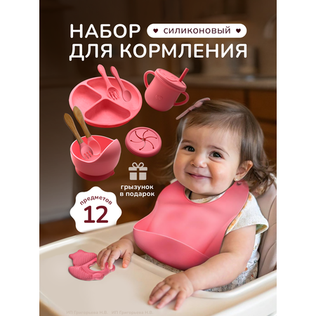 Набор для кормления силиконовый из 12 предметов подходит для детей от 4 месяцев до 7 лет. Комплект включает: тарелку на присоске, кружку -непроливайку с крышкой и трубочкой, крышку для снеков, нагрудник с кармашком, секционную тарелку на присоске, ложки и вилки, грызунок. Силиконовая посуда детская подходит для новорожденных девочек и мальчиков, для их кормящих мам, которые будут помогать малышам приобрести навыки аккуратного питания. Тарелочка на присоске, куда можно положить вкусную кашу, имеет безопасные закругленные края и надежно фиксируется, что обеспечивает безопасность и предотвращает опрокидывание. Секционная тарелка - мисочка выполнена с разными отделениями, ограниченными стенками - разделителями для сортировки пищи, в них удобно положить разные продукты, что выглядит эстетично и способствует повышению аппетита у малыша. Глубокий стаканчик - кружка овальной формы с дополнительной крышкой и отверстием для трубочек удобен для молока, молочных и фруктовых напитков. Силиконовый нагрудник для кормления имеет большой кармашек, крепление с кнопками и отверстиями позволяет адаптировать размер под шею ребенка, удобный, защищающий одежду ребенка фартук, используют вместо слюнявчика. Ложка для кормления безопасна для детских десен и зубов. Детская ложечка для кормления имеет небольшой объем, ее можно кусать и жевать вместо грызунка, мягкое покрытие не травмирует десны. Детский набор посуды подходит для самостоятельного приема пищи малышом. Кухонные столовые приборы можно ставить в микроволновую печь (микроволновку) для разогрева еды. Их можно мыть в посудомоечной машине и положить в холодильник на кухне. Силиконовый набор для кормления удобно брать с собой в дорогу и путешествие на автомобиле или автобусе, в поезде или самолете, для отдыха на даче или пикника на свежем воздухе на природе. Сертифицировано в России.