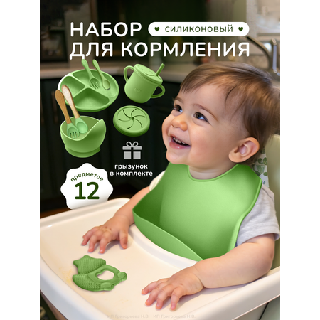 Набор для кормления силиконовый из 12 предметов подходит для детей от 4 месяцев до 7 лет. Комплект включает: тарелку на присоске, кружку -непроливайку с крышкой и трубочкой, крышку для снеков, нагрудник с кармашком, секционную тарелку на присоске, ложки и вилки, грызунок. Силиконовая посуда детская подходит для новорожденных девочек и мальчиков, для их кормящих мам, которые будут помогать малышам приобрести навыки аккуратного питания. Тарелочка на присоске, куда можно положить вкусную кашу, имеет безопасные закругленные края и надежно фиксируется, что обеспечивает безопасность и предотвращает опрокидывание. Секционная тарелка - мисочка выполнена с разными отделениями, ограниченными стенками - разделителями для сортировки пищи, в них удобно положить разные продукты, что выглядит эстетично и способствует повышению аппетита у малыша. Глубокий стаканчик - кружка овальной формы с дополнительной крышкой и отверстием для трубочек удобен для молока, молочных и фруктовых напитков. Силиконовый нагрудник для кормления имеет большой кармашек, крепление с кнопками и отверстиями позволяет адаптировать размер под шею ребенка, удобный, защищающий одежду ребенка фартук, используют вместо слюнявчика. Ложка для кормления безопасна для детских десен и зубов. Детская ложечка для кормления имеет небольшой объем, ее можно кусать и жевать вместо грызунка, мягкое покрытие не травмирует десны. Детский набор посуды подходит для самостоятельного приема пищи малышом. Кухонные столовые приборы можно ставить в микроволновую печь (микроволновку) для разогрева еды. Их можно мыть в посудомоечной машине и положить в холодильник на кухне. Сертифицировано в России.