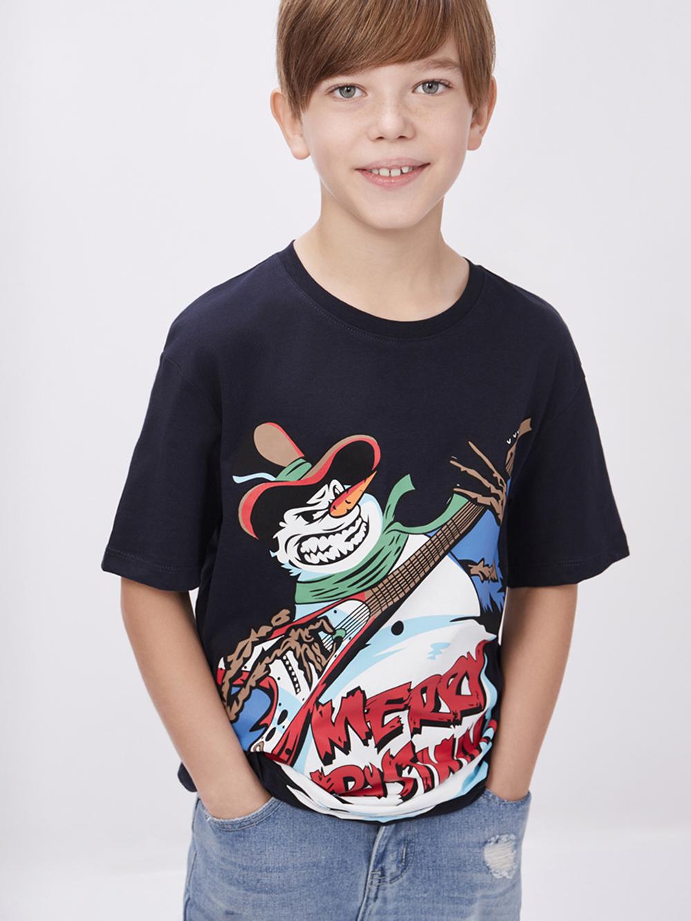 Новогодняя оверсайз футболка с круглым вырезом, спущенной линией плеча и рукавом до локтя выполнена из 100% хлопка. Широкую и длинную модель украшает принт с изображением злого снеговика с электрогитарой и надписью Merry Christmas – С Рождеством! Прикольный принт в стиле гранж порадует поклонника группы Король и шут или другого рок направления и любого подростка с чувством юмора.