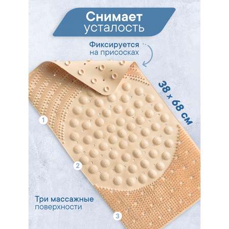 Коврик для ванной на присосках VILINA резиновый противоскользящий массажный 38х68 см "Лужайка" однотонный бежевый
