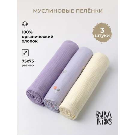 Пелёнки муслиновые BUBA KIDS, 3 шт., Таежные ягоды/ сирень/ сливочный, 75х75