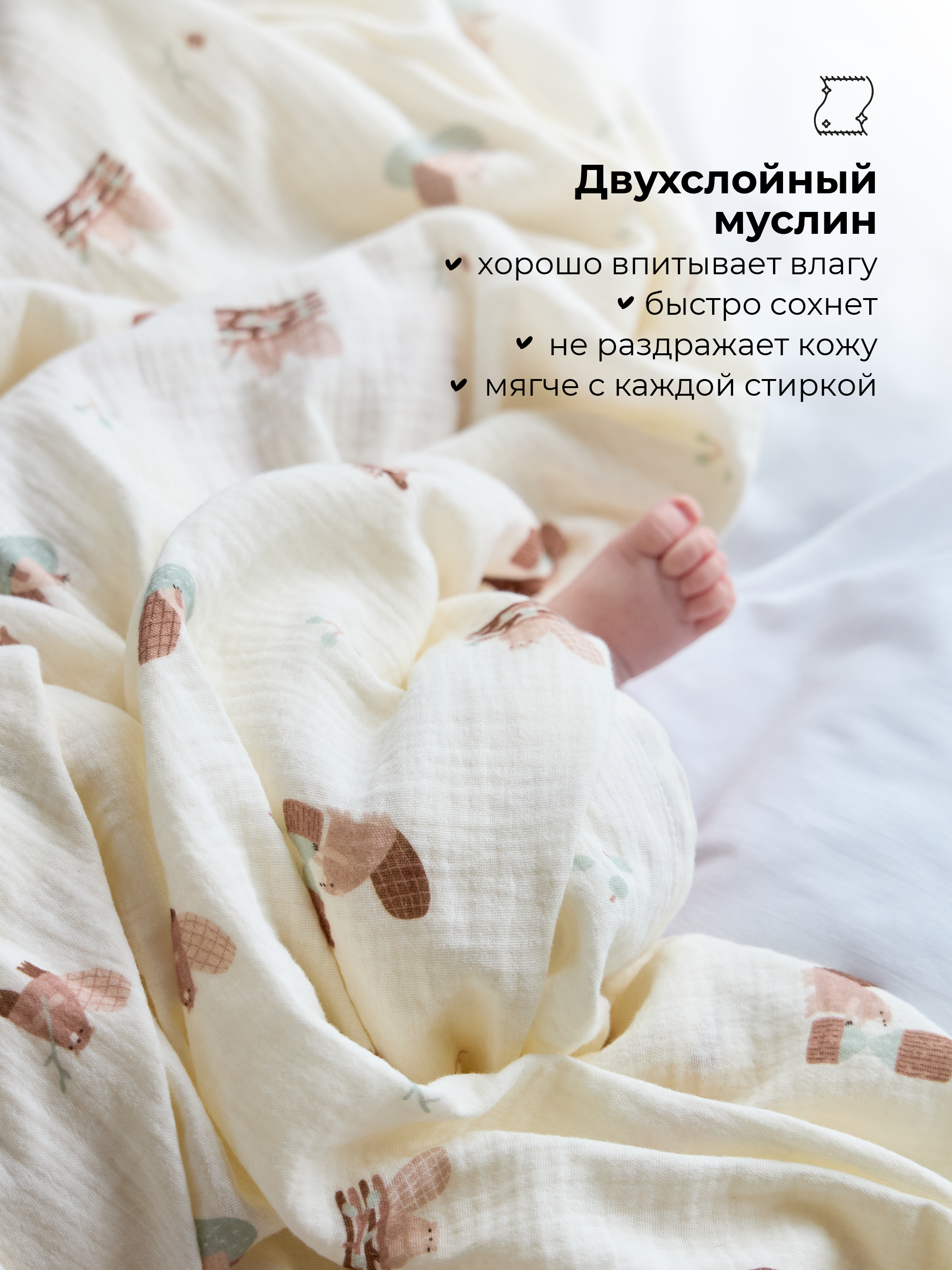 Лёгкая воздухопроницаемая ткань хорошо впитывает влагу и быстро сохнет, становится мягче с каждой стиркой. На пелёнках предусмотрена петелька, чтобы удобнее вешать на крючок в ванной или спальне. Плоские мягкие швы не раздражают нежную детскую кожу.