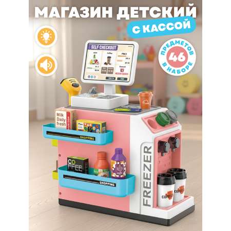 Игровой набор "Супермаркет" для игры в магазин обязательно понравится детям. В комплект входят: большой игрушечный прилавок с вывеской и полочками, кофейный аппарат, касса с игрушечным POS-терминалом и сканером, всевозможные продукты, а также игрушечная кредитная карта и игрушечные деньги. При проведении картой в POS-терминале и нажатии кнопки на сканере раздаётся звуковой сигнал и загорается световой индикатор. Эти особенности набора добавляют особую реалистичность игре. Игра развивает коммуникативные навыки, воображение, логику, мелкую моторику, а также тренирует навыки устного счета.