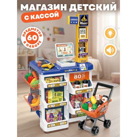 Игровой набор "Супермаркет" для игры в магазин обязательно понравится детям. В комплект входят: большой игрушечный прилавок с вывеской и полочками, кофейный аппарат, касса с игрушечным POS-терминалом и сканером, продуктовая тележка, всевозможные продукты, а также игрушечная кредитная карта и игрушечные деньги. При проведении картой в POS-терминале и нажатии кнопки на сканере раздаётся звуковой сигнал и загорается световой индикатор. Эти особенности набора добавляют особую реалистичность игре. Игра развивает коммуникативные навыки, воображение, логику, мелкую моторику, а также тренирует навыки устного счета.