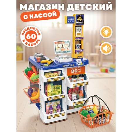 Игровой набор "Супермаркет" для игры в магазин обязательно понравится детям. В комплект входят: большой игрушечный прилавок с вывеской и полочками, кофейный аппарат, касса с игрушечным POS-терминалом и сканером, продуктовая корзина, всевозможные продукты, а также игрушечная кредитная карта и игрушечные деньги. При проведении картой в POS-терминале и нажатии кнопки на сканере раздаётся звуковой сигнал и загорается световой индикатор. Эти особенности набора добавляют особую реалистичность игре. Игра развивает коммуникативные навыки, воображение, логику, мелкую моторику, а также тренирует навыки устного счета.