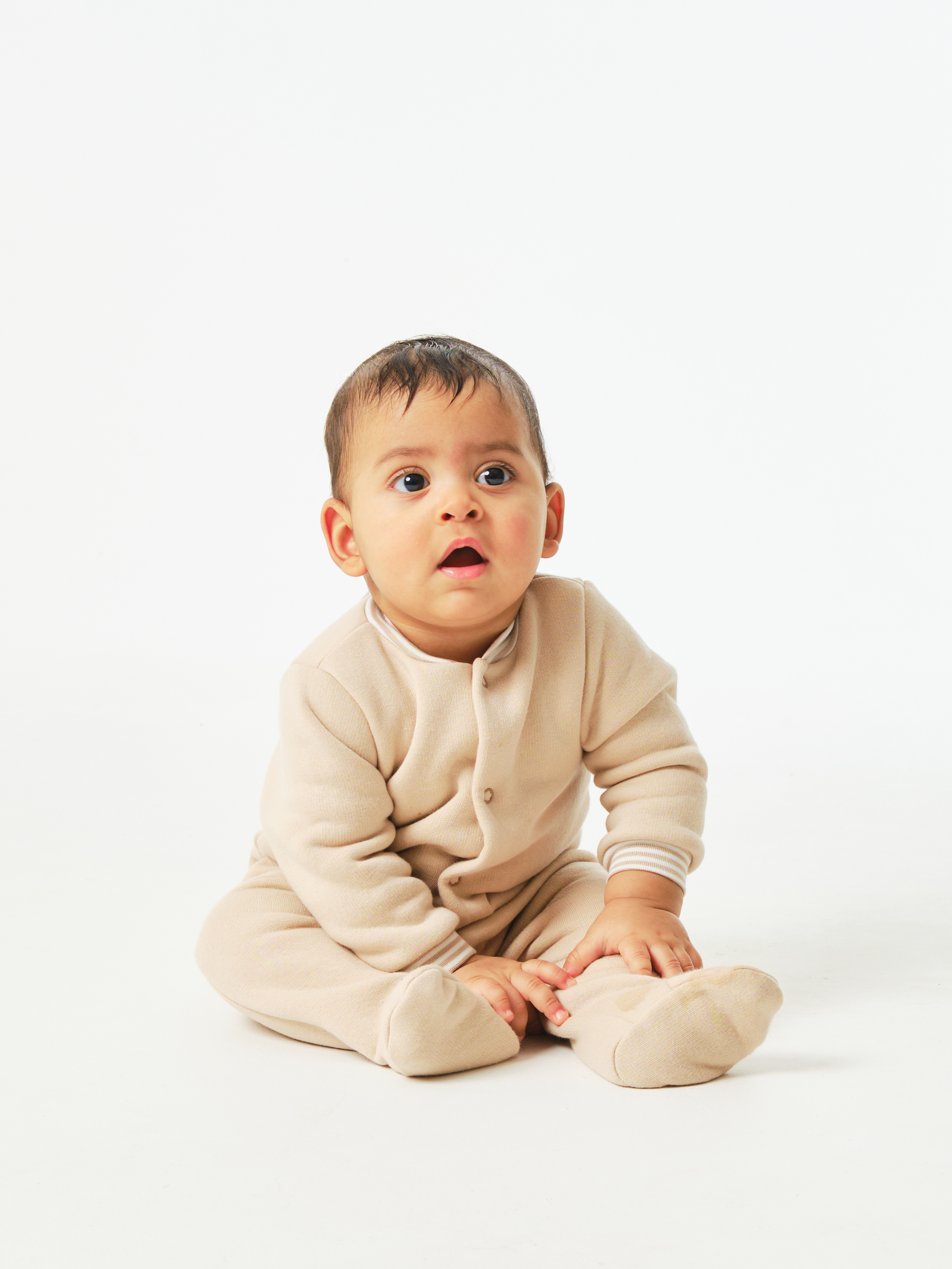 Комбинезон детский из 3-х ниточного футера с начесом. Комбинезон теплый и уютный. Рукава длинные с манжетами в полоску по низу, ножки закрыты. Застежка комбинезона из футера центральная на кнопках, уходит в ножки. Комбинезон без подкладки и без утеплителя. Подходит как для прогулок в теплое время года, так и для поддевания под зимние вещи.
