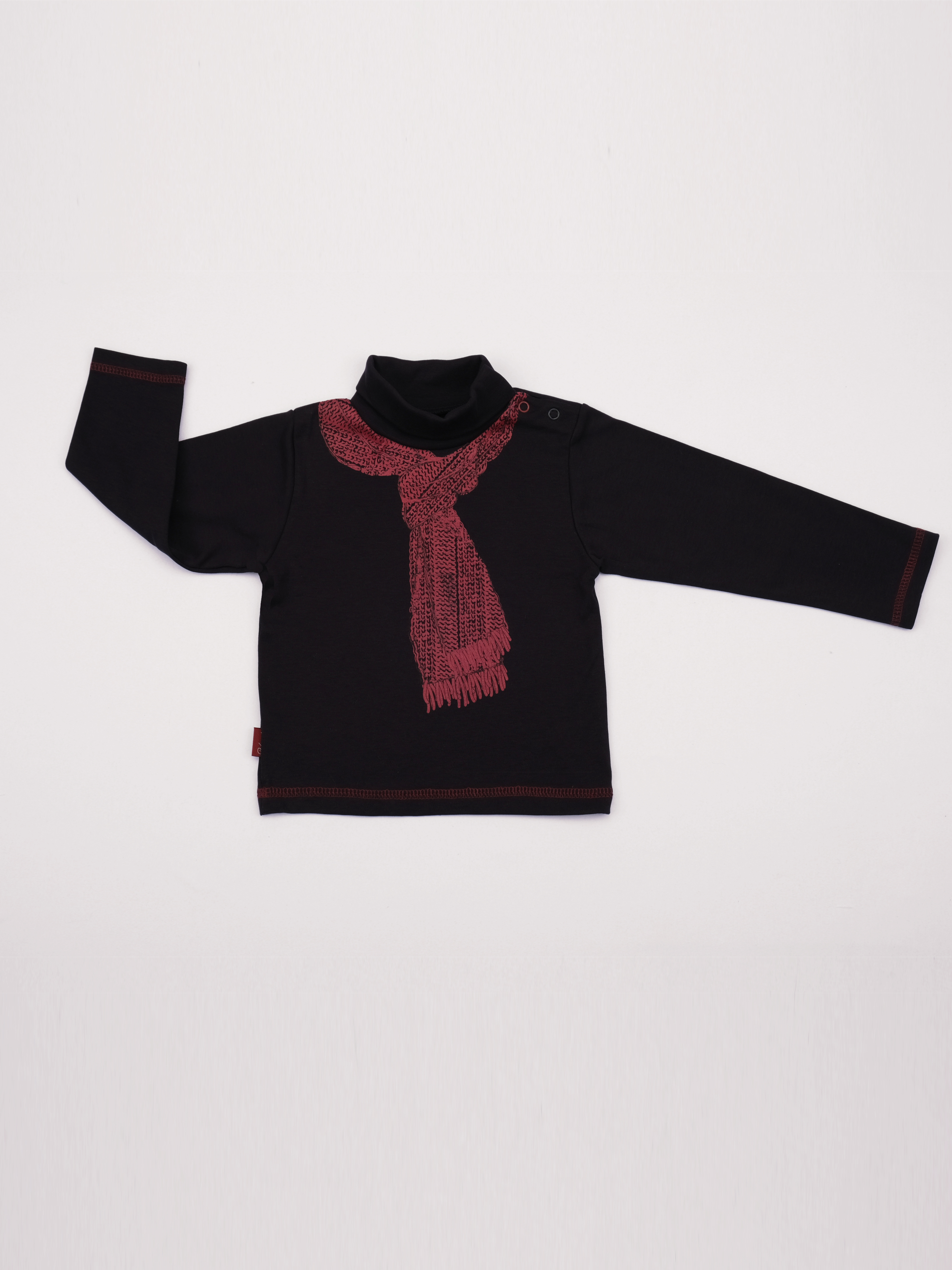 Водолазка прямого силуэта из интерлока темно-синего цвета, украшен печатью имитирующей шарфик. Воротник высокий с отворотом и застежкой в плече на кнопки. Рукава длинные. К такой водолазке отлично подойдут любые джинсы или брючки. Нарядный образ готов.
