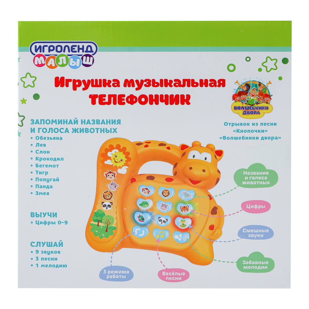 Игрушка музыкальная "Телефончик" от ИГРОЛЕНД со световыми и звуковыми эффектами – это интерактивная развивающая игрушка для малышей в виде забавного жирафа.