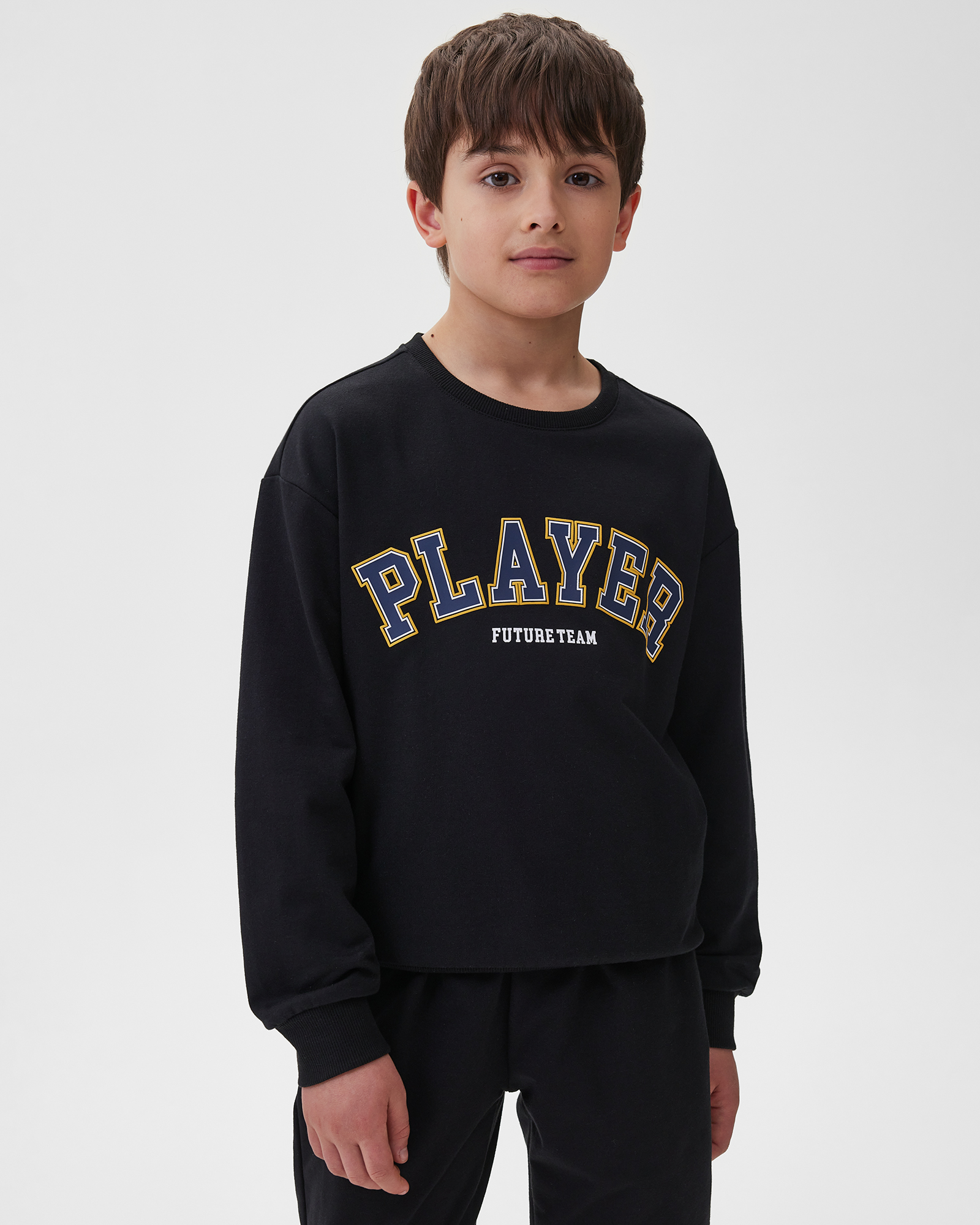 Чёрный спортивный костюм для мальчика Futurino School из однотонных брюк и свитшота с надписью "Player future team".