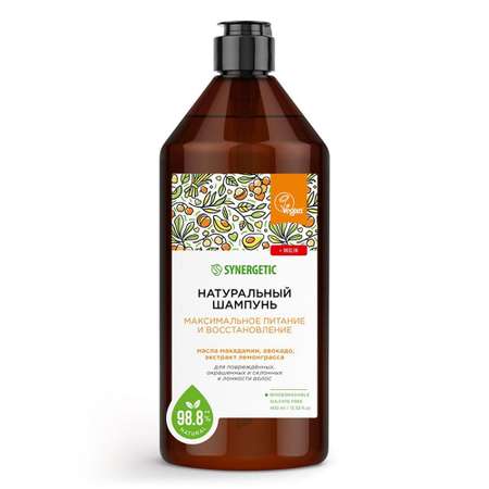 Бессульфатный шампунь Synergetic 'Максимальное питание и восстановление' - эффективное средство для очищения кожи головы и поврежденных, окрашенных, склонных к ломкости волос - более чем на 98% состоит из натуральных компонентов. Шампунь деликатно очищает, эффективно ухаживает за волосами и защищает кожу головы. Благодаря входящему в состав природному инулину волосы становятся более гладкими, ухоженными и блестящими. Натуральный шампунь содержит комплекс масел макадамии, тыквенных семечек и авокадо, который оказывает восстанавливающее действие. Активные компоненты в составе шампуня укрепляют волосы и стимулируют восстановление кератиновых волокон. Экстракты лемонграсса и франжипани оказывают тонизирующее воздействие. Мультифункциональный компонент натурального происхождения софоролипид мягко очищает кожу головы и сохраняет естественный микробиом, а инновационный увлажняющий комплекс усиливает барьерные свойства кожи и обеспечивает до 72 часов глубокого увлажнения. Физиологичный уровень pH 5,5 устраняет сухость кожи головы и гарантирует безопасность при частом использовании средства даже для чувствительной кожи. Натуральный шампунь не содержит SLS, SLES, парабенов, силиконов, минеральных масел и красителей, а также компонентов животного происхождения, не тестируется на животных и сертифицирован британской организацией The Vegan Society. Знак Vegan - мировой стандарт этичной продукции. Способ применения: нанести небольшое количество шампуня на влажные волосы, хорошо вспенить и тщательно смыть водой. При необходимости повторить процедуру. Возможно появление естественного осадка натурального происхождения и незначительное изменение цвета шампуня, не влияющие на его качество и свойства Меры предосторожности: При попадании в глаза, промыть водой. Только для наружного применения. Хранить отдельно от еды. Состав: Aqua; Lauryl Glucosidex; Sodium Lauroyl Methyl Isethionate; Cocamidopropyl Betainex; Candida Bombicola/Glucose/Methyl Rapeseedate Fermentx; Lauroyl/Myristoyl Methyl Glucamidex; Inulinx (растительный пребиотик); Macadamia Seed Oil Polyglyceryl-4 Estersx (масло макадамии); Pumpkin Seed Oil Polyglyceryl-4 Estersx (масло тыквенных семечек); Olive Oil Polyglyceryl-4 Estersx (масло оливы); Cymbopogon Citratus Extractx (экстракт лемонграсса); Plumeria Alba Flower Extractx (экстракт франжипани); Glycerinx; Coco Glucosidex; Glyceryl Oleatex; Sodium Cocoyl Isethionate; Triticum Vulgare (Wheat) Protein; Saccharide Isomeratex; Hydroxypropylgluconamide; Hydroxypropylammonium Gluconate; Glycol Distearate; Glyceryl Stearatex; Persea Gratissima Oilx (масло авокадо); Guar Hydroxypropyltrimonium Chloridex; Sodium Chloride; Sodium Benzoatex; Parfum; Tetrasodium Glutamate Diacetatex; Sodium Citrate Хранить при температуре от +5 до +25 °С вдали от нагревательных приборов и огня. Не допускается хранение под непосредственным воздействием солнечного света. Срок годности: 36 месяцев с даты производства при соблюдении условий хранения.Характеристики