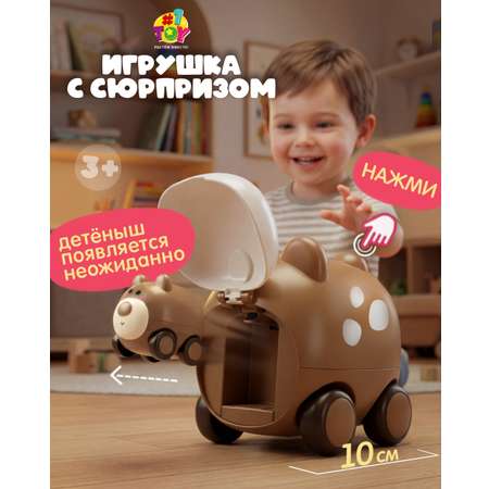 Машинка катапульта Медведь 1TOY Убегай-ка — это оригинальная машинка детская, которая готова порадовать ребенка сюрпризом. На вид — это забавный мишка, а внутри него спрятан медвежонок, который выскакивает наружу при нажатии на кнопку. Машинка детская игрушка оснащена фрикционным механизмом, позволяющим ей ехать вперед после небольшого толчка, добавляя реалистичности в игру.