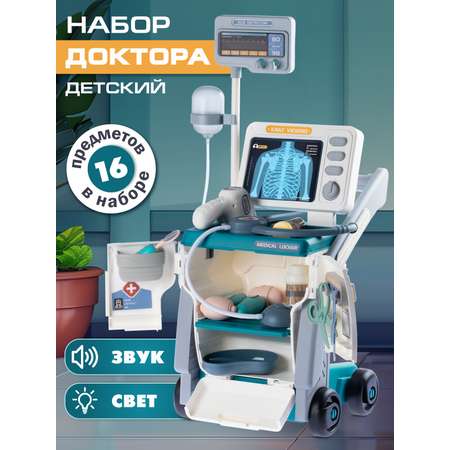 Большой игровой набор ДОКТОР из 16 предметов. С ним ваш ребенок станет настоящим врачом! В процессе игры юный врач произведёт осмотр, назначит лечение, выпишет лекарства, а также узнает о применении медицинских инструментов. Ребенок сможет провести обследование, сделать рентген, проверить пульс, измерить температуру, сделать укол, капельницу.