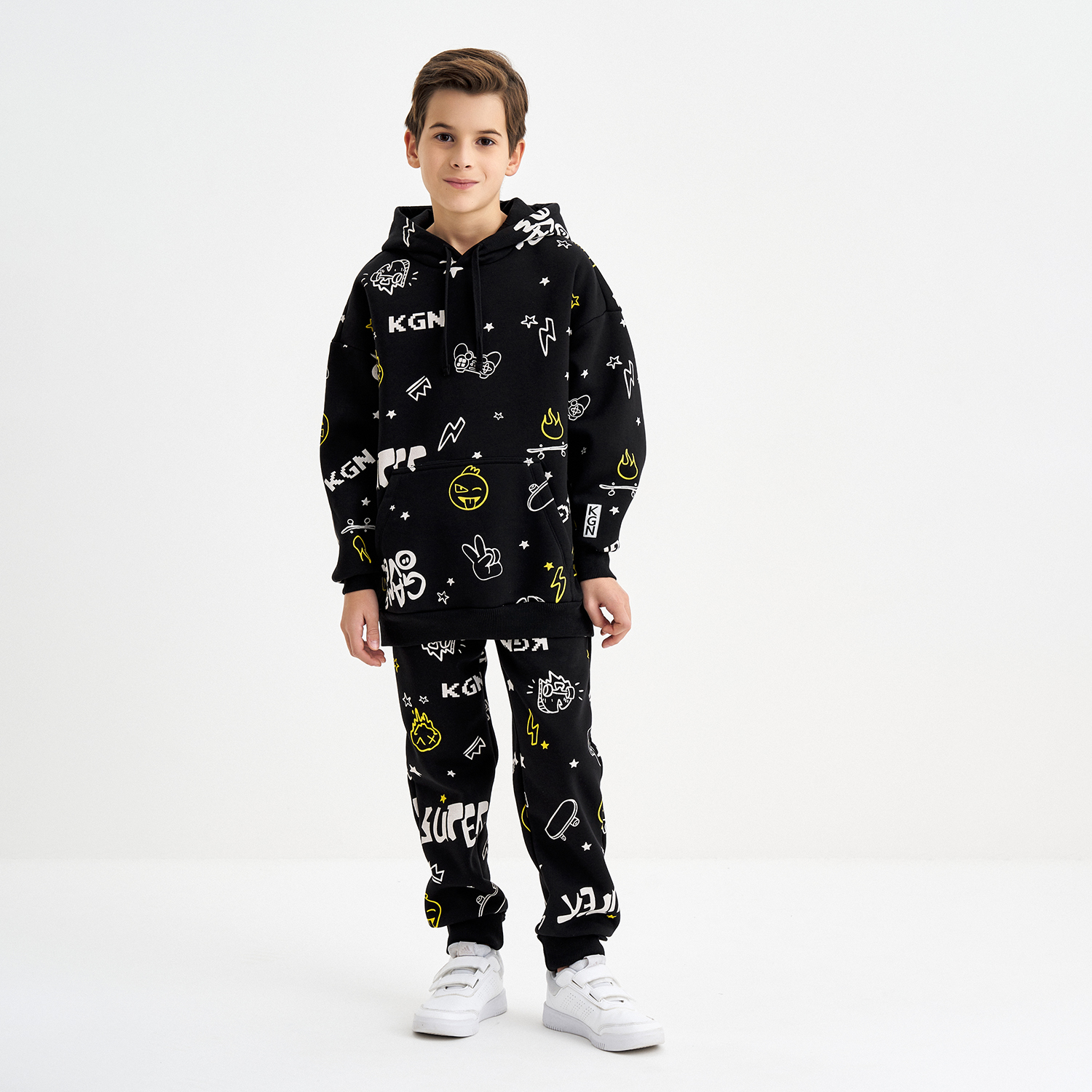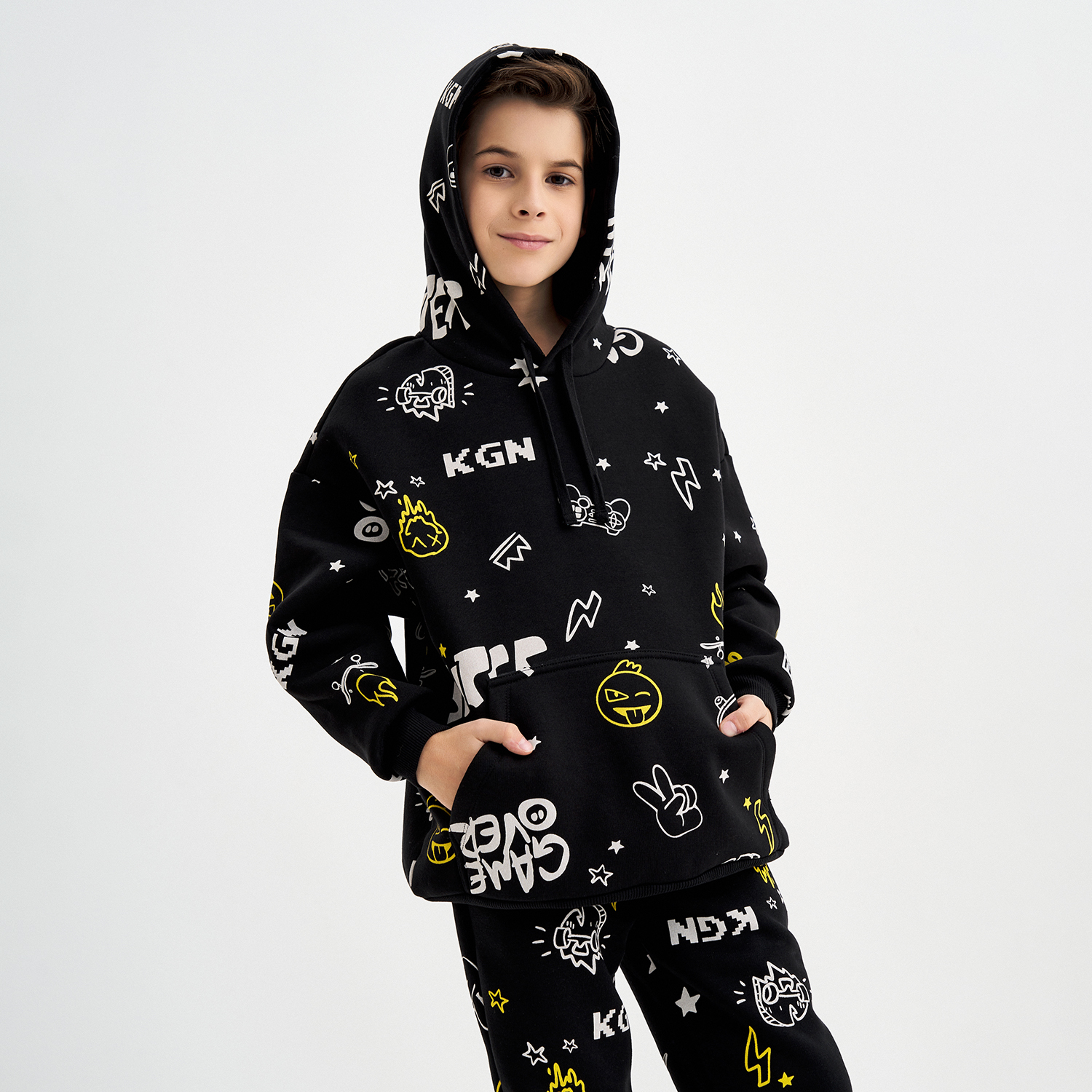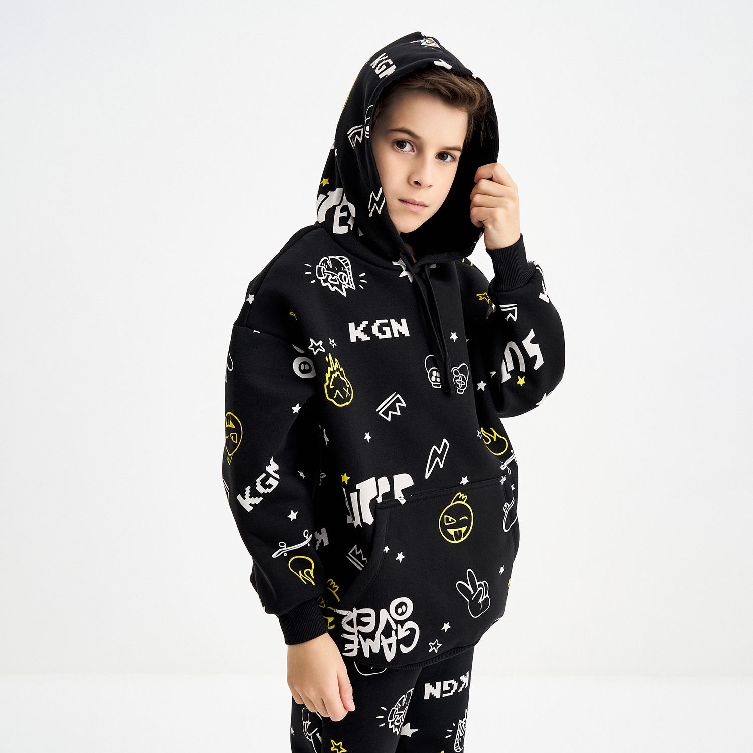 Теплая и уютная толстовка для мальчика на флисе – лучший выбор для холодной осени и зимы. Спортивная модель с карманом-кенгуру, схожая с худи, невероятно популярна среди подростков. Выполненная из утепленного футера премиального качества, она подарит тепло и комфорт. Мягкий начес, похожий на флисовый, согреет в холода. Удлиненный крой дополнительно обеспечит защиту от ветра. Глубокий капюшон оснащен удобным затягивающимся шнурком. Толстовка для девочки оверсайз аккуратно сидит на любой фигуре за счет манжет на рукавах и снизу, которые способствуют комфортной посадке. Кофта для мальчика не сковывает движений и оптимально подходит для прогулок по городу и активного отдыха. Отлично комбинируется с любым низом и станет самой любимой вещью у ребенка! Модный принт и надписи понравятся мальчикам и девочкам вне зависимости от их возраста. В размерной сетке – востребованные детские и подростковые размеры.