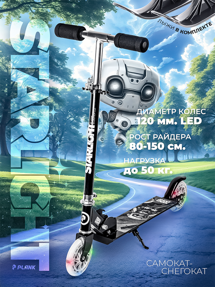 Самокат оснащен: Алюминиевая рама с размером деки 40,5 на 9,5 см, рабочая поверхность 34,5 на 9,5 см, дорожный просвет 6 см. Руль с 4-мя диапазонами настройки высоты самоката 62-73-78-84 см, ширина руля 33см. Самокат в комплекте как с колесами так и с лыжами. Полиуретановые колеса 120мм со светящимися, яркими LED диодами с надежными износостойкими подшипниками ABEC 9. Лыжи сделаны из высококачественного морозостойкого полиэтиленового пластика - не боятся мороза. Выполнены по схеме "твин-тип", имеют закругления на обоих концах, что позволяет двигаться как вперед, так и назад. Лыжи снабжены продольными углублениями, позволяющими удерживать траекторию при катании. Для фиксации универсальных самокатных лыж не требуются специальные инструменты и навыки. Устанавливаются вместо стандартных колес. Самокат подходит детям и подросткам - максимальная высота руля 84см от земли до ручек. Максимальная нагрузка 50кг. Возраст 3+.